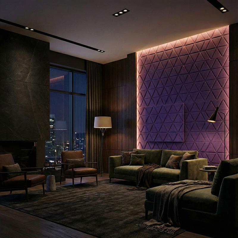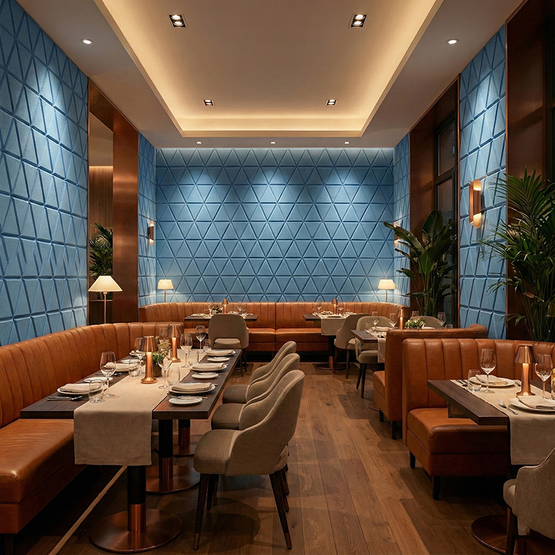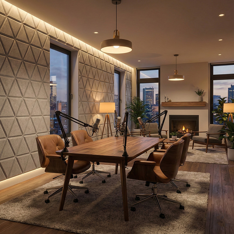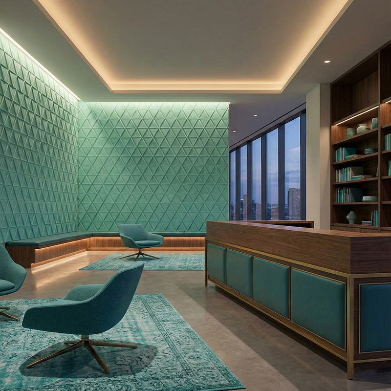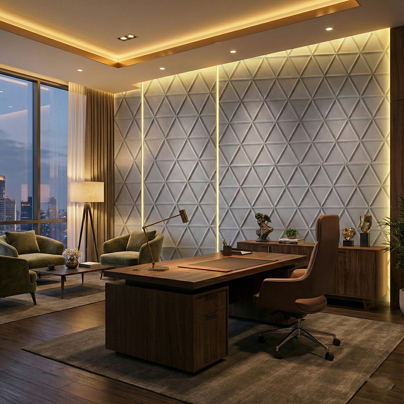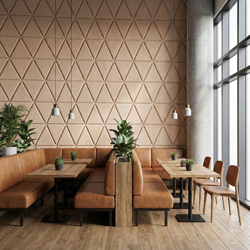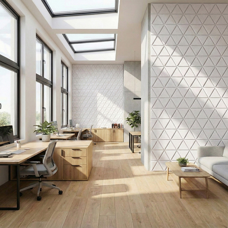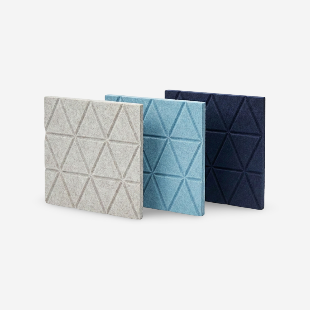 These geometric acoustic panels bring rhythm and visual balance to walls. In addition, the modern triangle pattern works well in contemporary commercial and residential interiors.