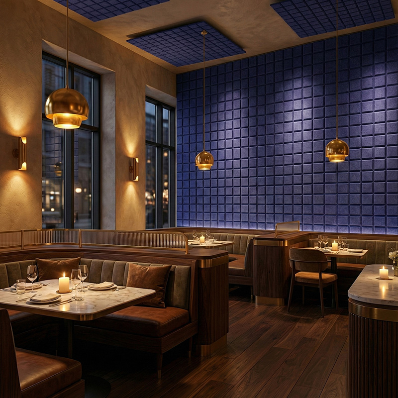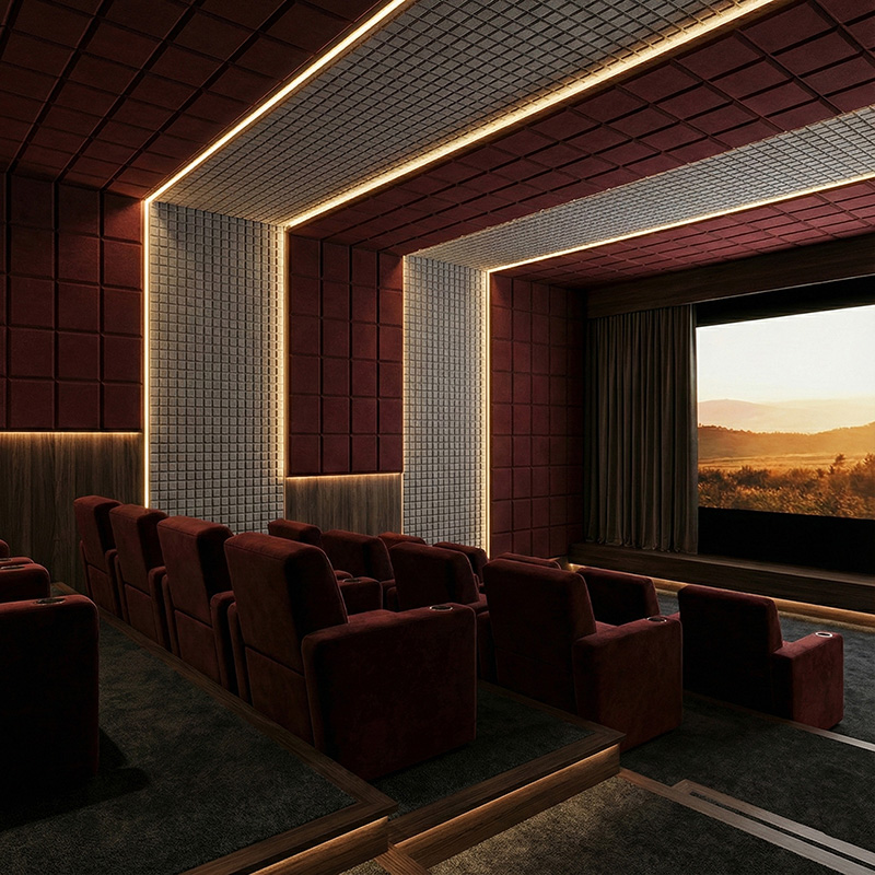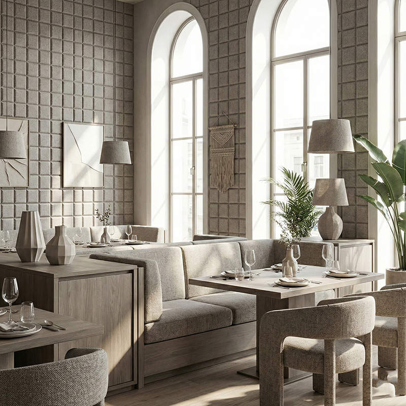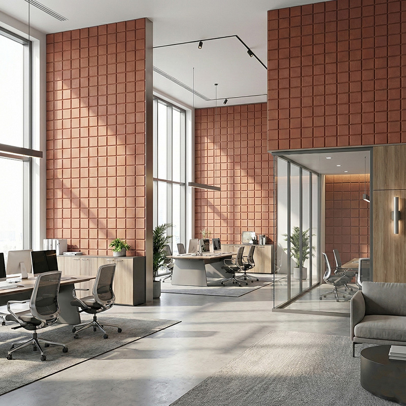 Thanks to its clean lines and balanced proportions, this modern acoustic wall panel fits easily into many interior styles. For example, it can be used in open-plan offices, corridors, libraries, home theaters, gaming rooms, and hotels. Additionally, the square format allows for modular layouts and creative wall patterns, making it a versatile decorative acoustic panel solution.