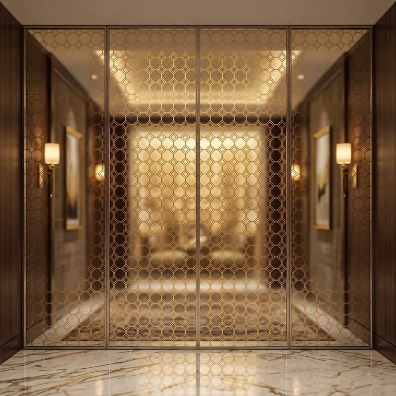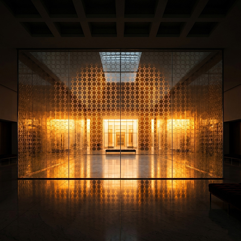 This product is manufactured using 4mm crystal float glass + 1.52mm interlayer + 4mm crystal float glass, ensuring excellent durability and safety. Moreover, the precision-crafted diamond pattern enhances depth and reflection, making it a standout choice for luxury interior glass design. The option to integrate gold pattern glass panels further elevates the aesthetic, creating a high-end architectural finish. In addition, its large panel sizes allow seamless installations with minimal joints.