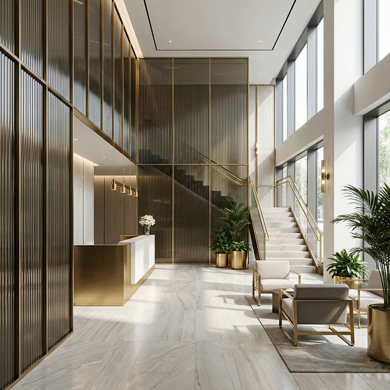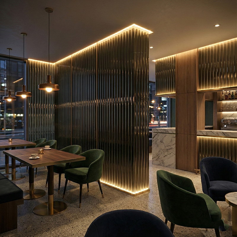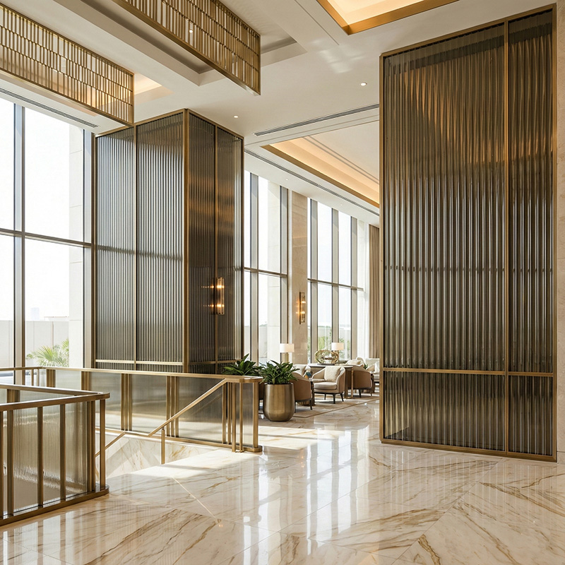 For interior use, the panels suit fluted glass for interior partitions. Likewise, they work well for feature walls and cladding. In addition, they can be used for doors, windows, and balustrades. Similarly, they enhance façades, lobbies, and reception areas. Ultimately, they fit offices, hotels, retail, and luxury residences.