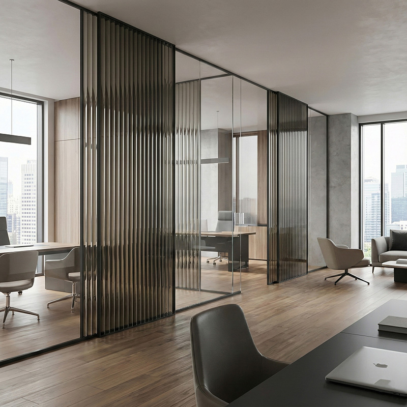 Light travels gently through the fluted pattern, highlighting each rib and crease. At the same time, the glass provides a soft privacy effect. This makes it ideal for interior glass wall panels, partitions, and dividers. In darker tones, such as black or bronze, the pattern appears richer and more dramatic.