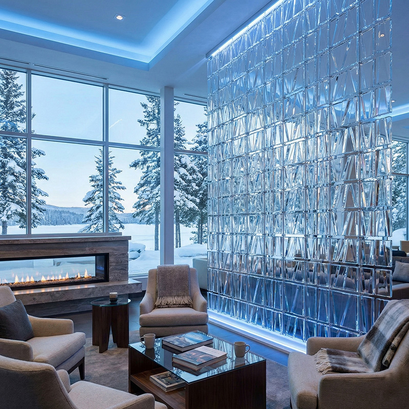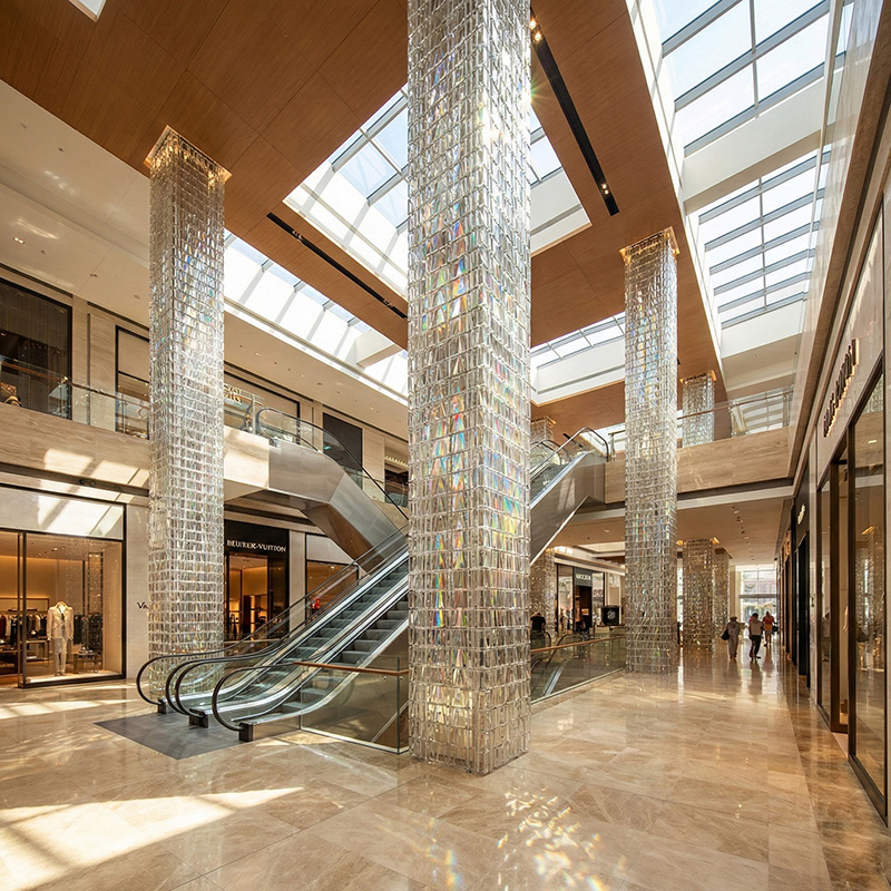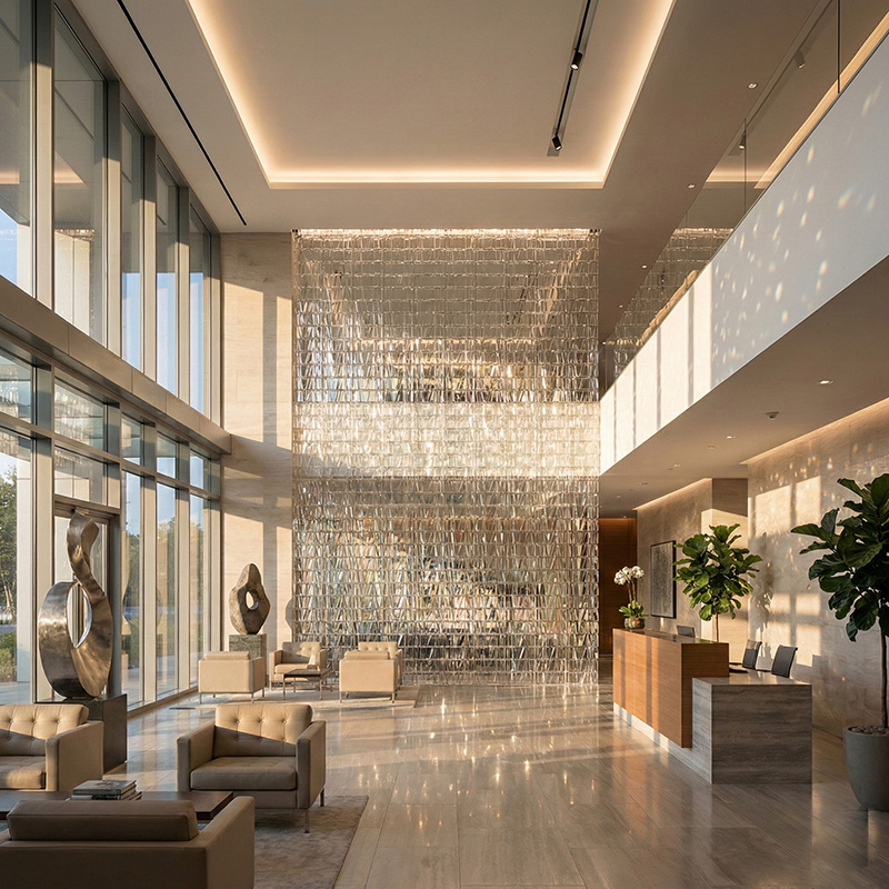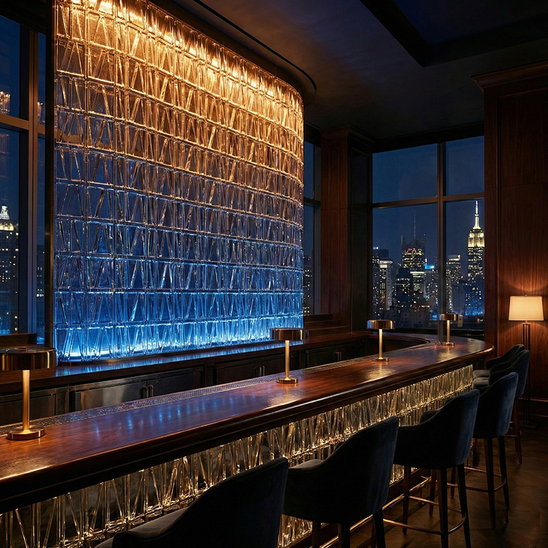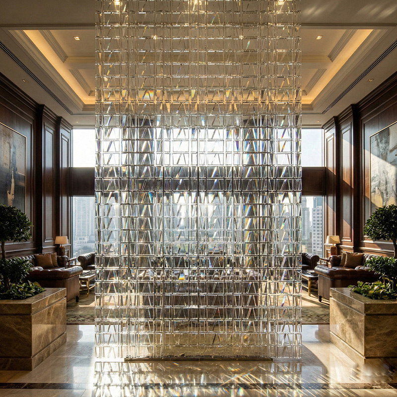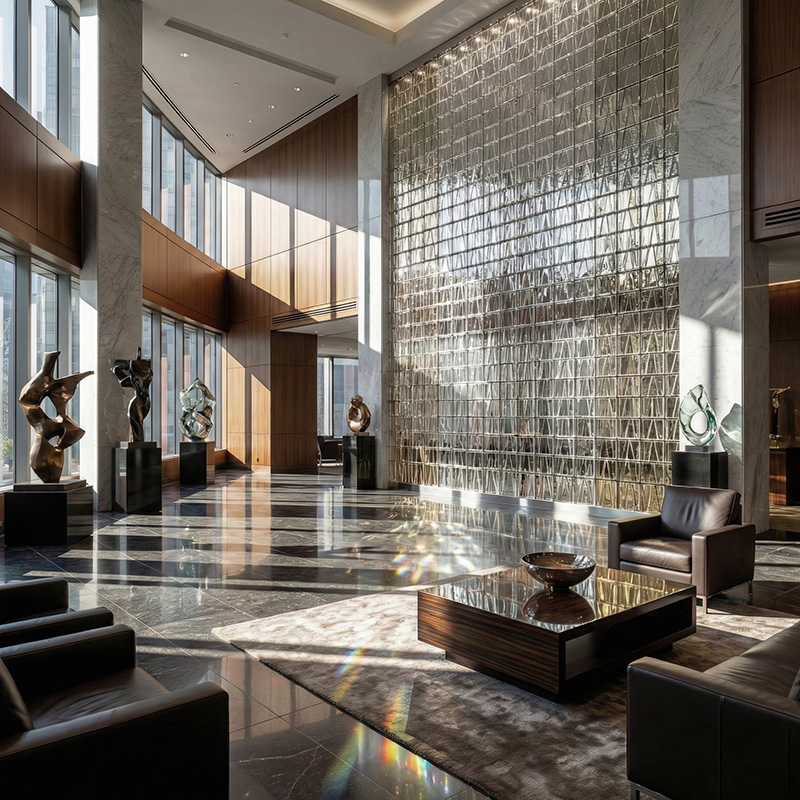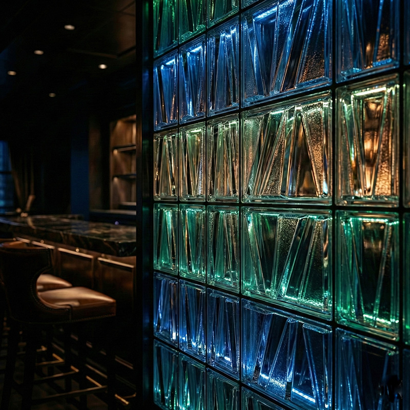 - Architectural prismatic glass tile installations with lighting