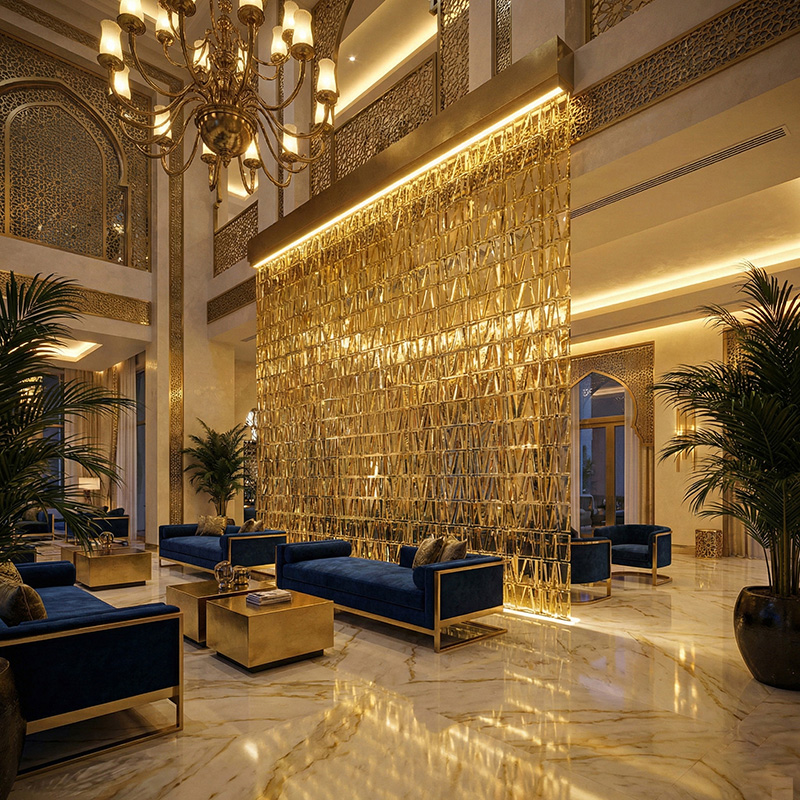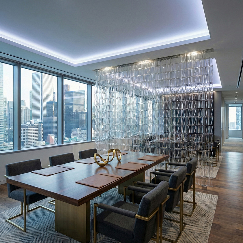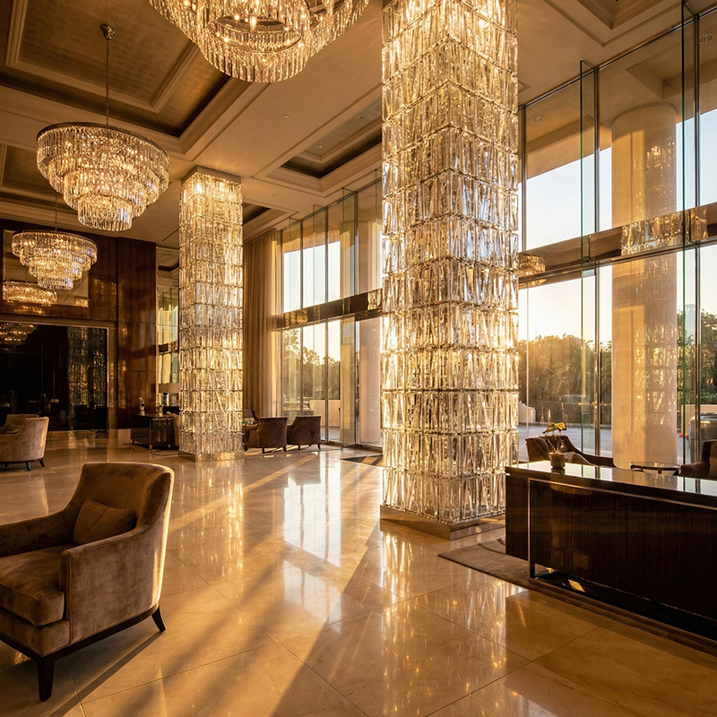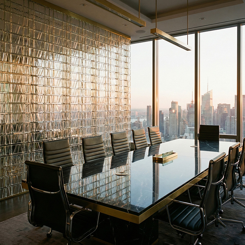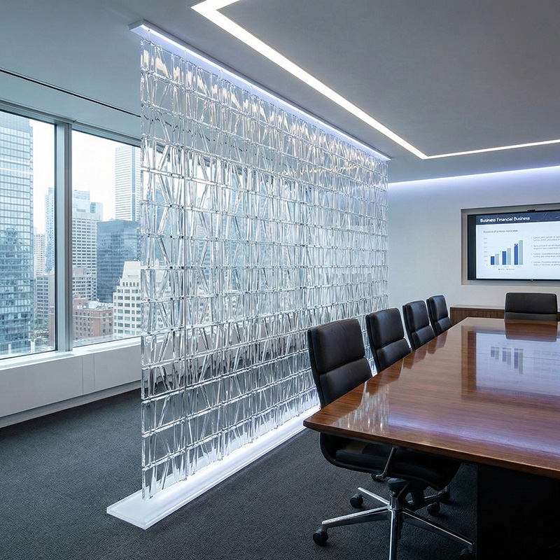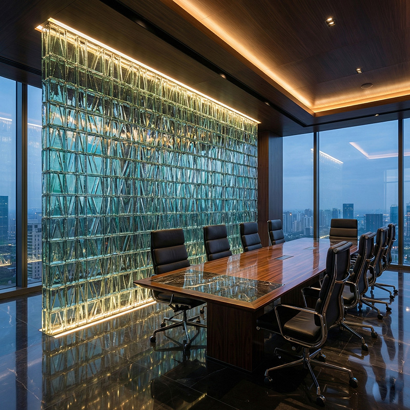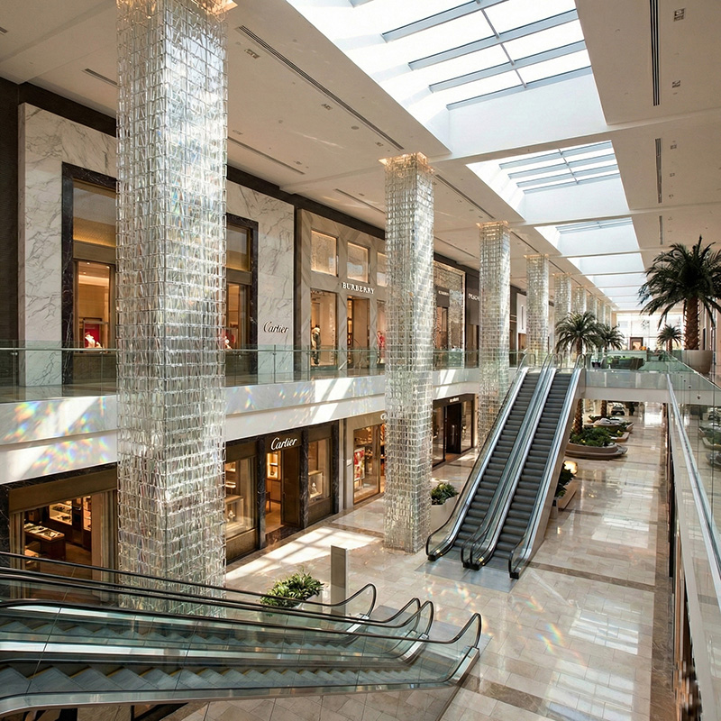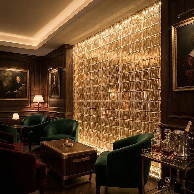 - Architectural prismatic glass tile installations with lighting
