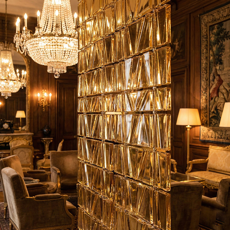 This prismatic glass wall tile is made from high-quality moulded crystalline glass. Therefore, it delivers excellent clarity, strength, and long-term performance. Each unit is available in transparent crystal or vibrant colors, making it perfect for colored glass wall tiles and custom interior concepts.